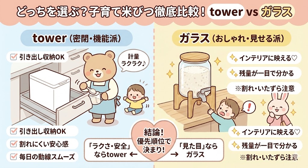 結論から言うと、子育て家庭で「毎日のラクさ・こぼしにくさ・収納のしやすさ」を優先するなら、tower(タワー)密閉米びつ10kg(5423/5424)が選びやすいです。引き出し収納を想定したサイズ・密閉パッキン・すくいやすい形など、日々の炊飯動線を短くする設計が明確です。