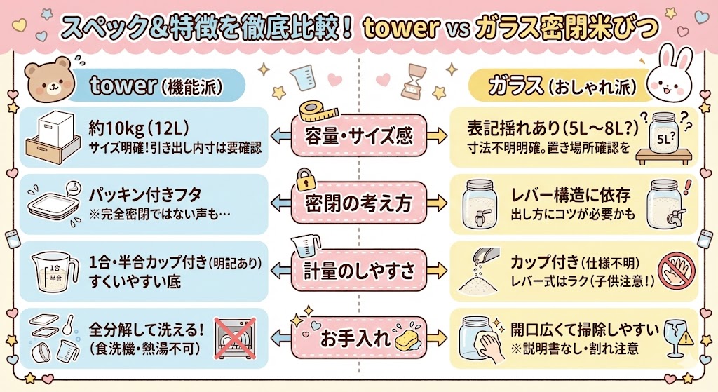 なのでtowerは、最初に一度「分解→洗う→組み直す」を落ち着いてやって、クセを掴むのが安心です(説明上は分解洗い可)。